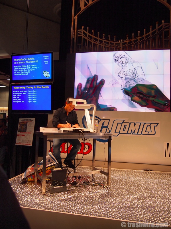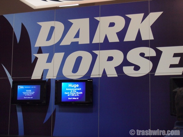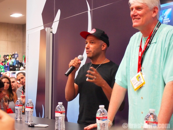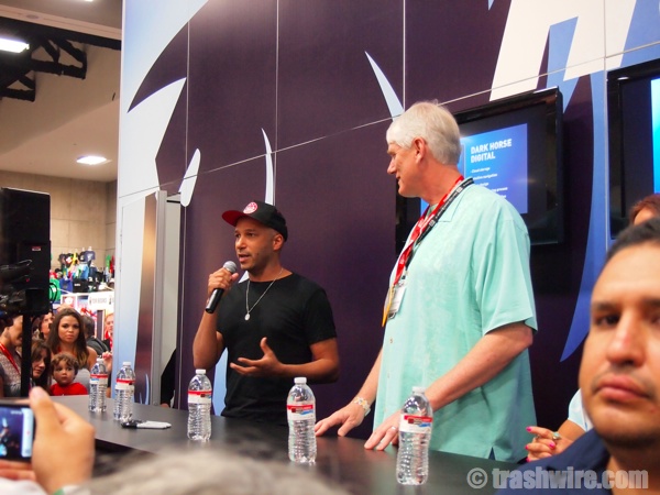 Here it is, gang! Technically, the fun doesn’t start until today, but we got pics from last night’s Preview Night for you here. Lego was out in full force with Lego Batman, Boba Fett, Bumblebee and more. There weren’t many people in costume yet, but there were two girls dresses as slave girl Leia. The big news of the night was Dark Horse’s “big reveal”. After announcing that Guillermo del Toro would not be appearing, Mike Richardson brought out Tom Morello to announce his new comic, Orchid. It was a quickie announcement, but fans are sure to hear more about Orchid throughout the con.